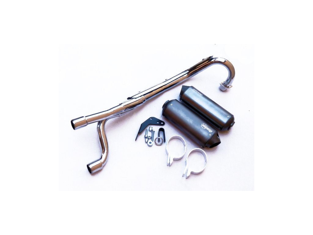 originálne pitbike Stomp, DemonX, WPB, Tomanon; kompletný výfuk CRF70 s dvojitou koncovkou, priemer do motora 32mm, do koncoviek 38mm, v sade zvod, 2x koncovka strieborná, 2x objímka, 1x výfukové tesnenie, 2x úchytky k rámu možno použiť na modely: Stomp Z3( všetky modely) Stomp Z140 DemonX XLR DemonX Detroit170Dodatočné parametre