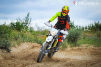 Minuloročný model mi po presadnutí z mojej hubárskej Bety Alp 4.0 pripadal skoro ako dakarský špeciál, ktorý sa aj napriek vyššej hmotnosti ľahúčko ovládal. Vedela som preto, do čoho zhruba idem. Dráha bola po daždi z predchádzajúcej noci ešte miestami mokrá a na „cestných štupľoch“ celkom šmykľavá. Po pár nechcených driftoch som svoje pomalé tempíčko radšej ešte spomalila, aby som sa nevysypala hneď v prvom kole. Po chvíli som si na to už celkom zvykla a aj keď sa snažím väčšinou jazdiť postojačky, teraz som si do zákrut radšej sadala, aby zadok toľko nešmýkal. Keďže mi zakázali jazdiť endurovú technickú časť dráhy (vzhľadom na jej náročnosť, moje schopnosti a hlavne cenu motorky :), jazdila som len po MX trati.