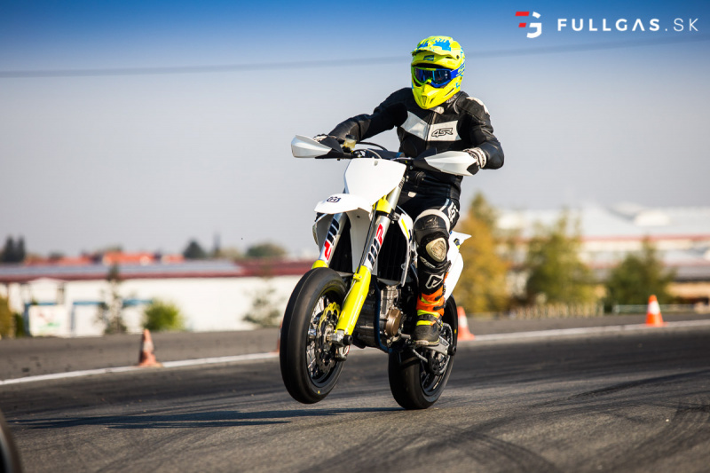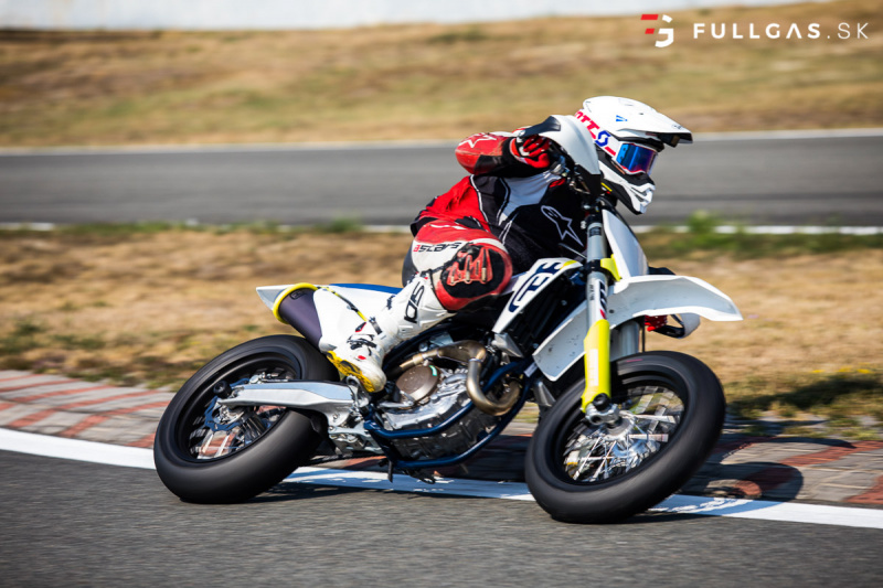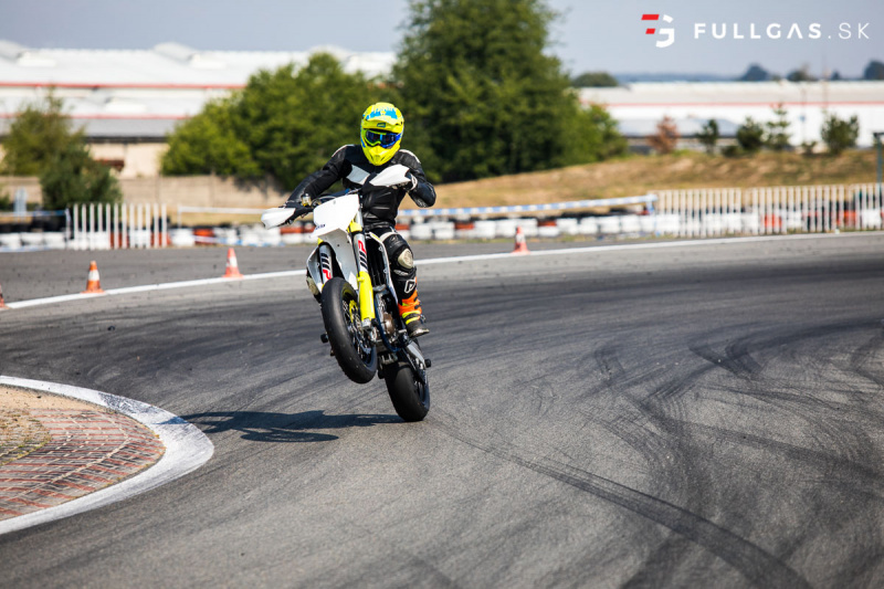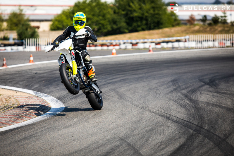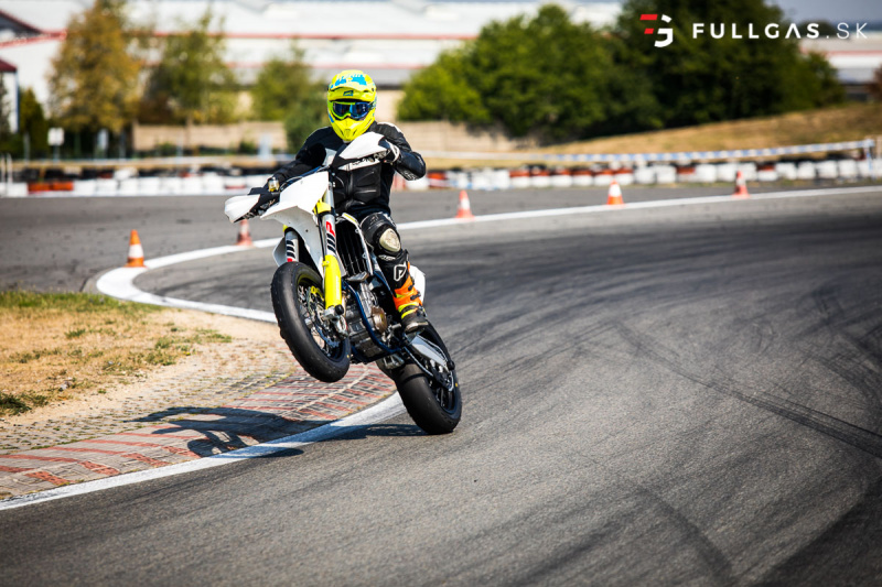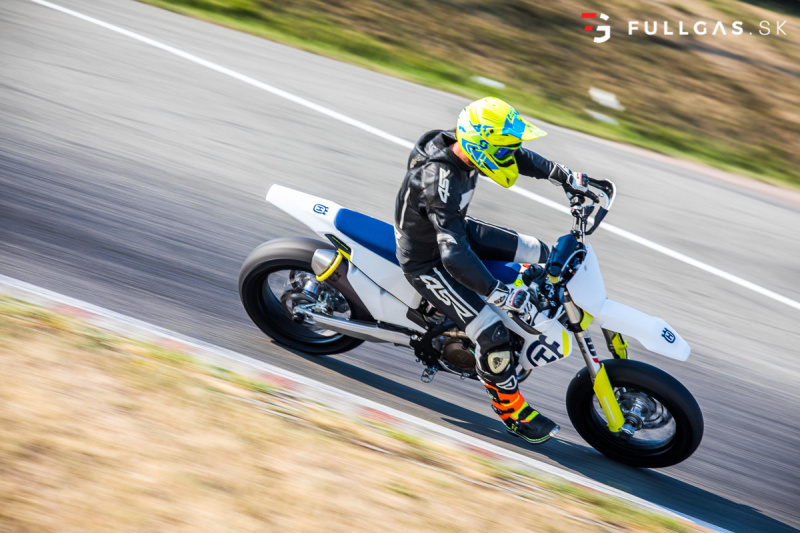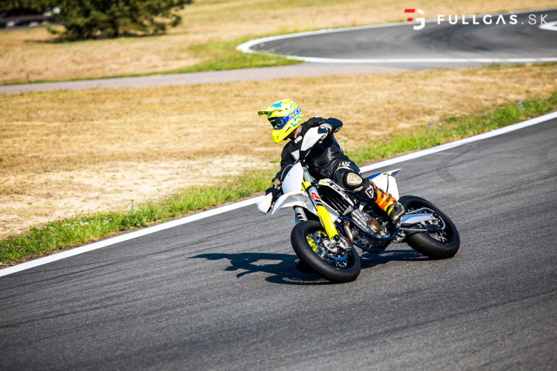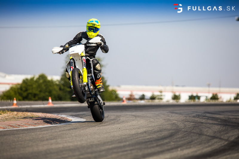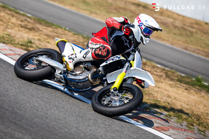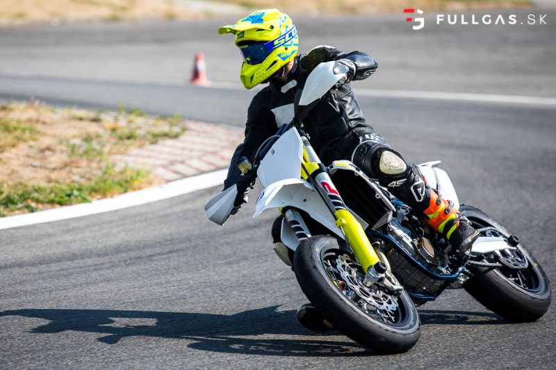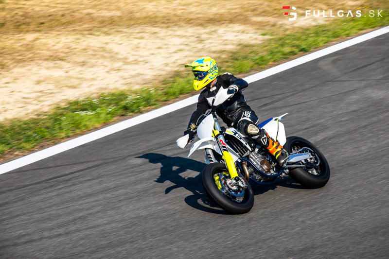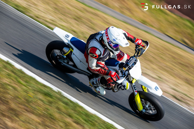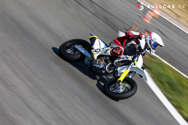 Husku som mal možnosť pojazdiť aj vďaka silnicnimotoskola.cz v rámci ich motoškoly a voľného jazdenia na Autodrome vo Vysokom Mýte. Organizácia, jedlo, pitie, sociálky a hlavne trať s perfektným asfaltom. K tomu, samozrejme, skúsení jazdci a inštruktori, ktorí boli ochotní vždy pomôcť a poradiť aj s technikou jazdy. Ich rady a tipy mi dosť pomohli zmeniť štýl a vtedy som dokázal FSku ešte lepšie odskúšať. Na prvé ranné kolá sadám na motorku s 0,3 motohodinami, bez nahriatia pneu a s nenaučenou traťou. Od úplného začiatku som milo prekvapený veľkosťou, vlastne skôr minimálnosťou a tým, ako mi sadla hneď do ruky. Pri príjazde na trať ešte doladiť za jazdy spoječku a šup ho učiť sa trať. Na motorku si zvykať fakt netreba. Pár kôl decentne, sem tam mi ešte zadné trochu odskakuje na brzde, ale nič nepredvídané. Po viac ako pol hodine idem z toho dolu, aj keď sa mi vôbec nechce. Je to paráda, a to som ešte ani nezačal tlačiť na moje limity. Neskôr výmena oleja a filtra, podfúkli sme pneu na 1,8 za tepla, trochu ešte pridvihli páčky, doplnili benzín a šup ho znova na trať, ale teraz už za doprovodu Milana, inštruktora z motoškoly a môjho známeho, ktorý má FSko model 2018.