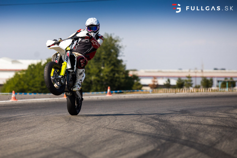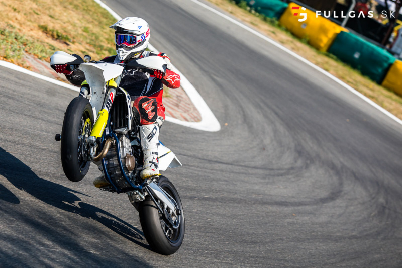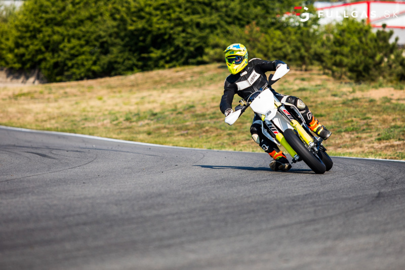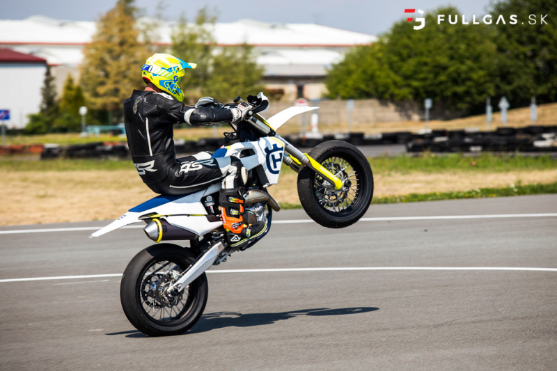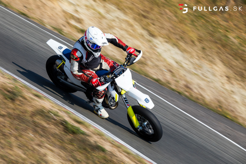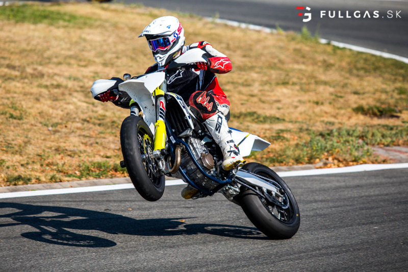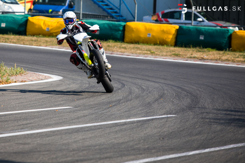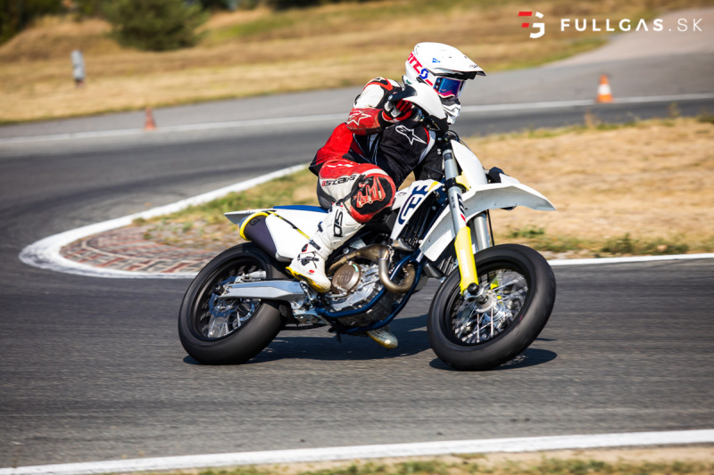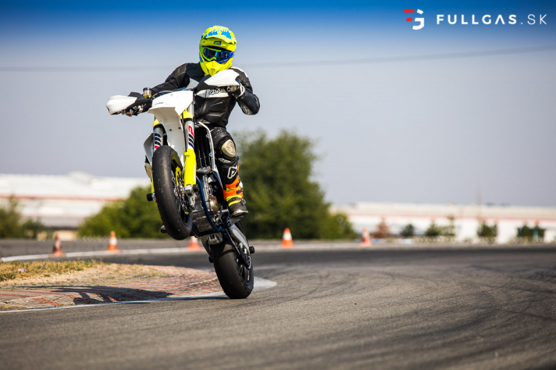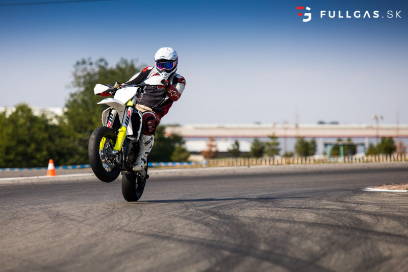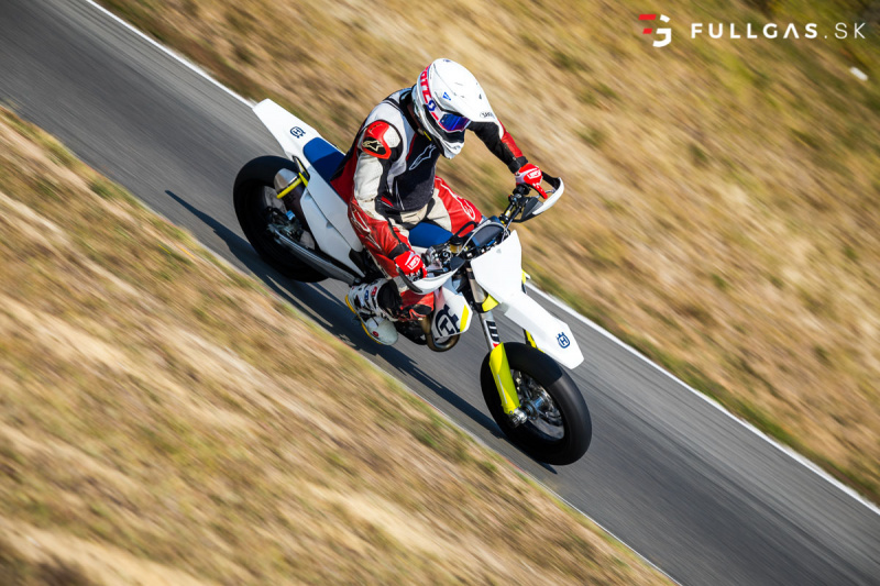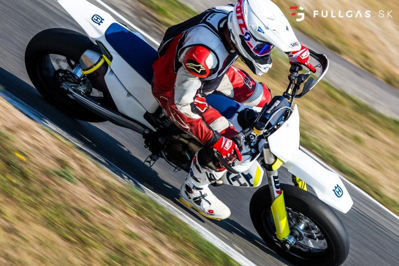 Husku som mal možnosť pojazdiť aj vďaka silnicnimotoskola.cz v rámci ich motoškoly a voľného jazdenia na Autodrome vo Vysokom Mýte. Organizácia, jedlo, pitie, sociálky a hlavne trať s perfektným asfaltom. K tomu, samozrejme, skúsení jazdci a inštruktori, ktorí boli ochotní vždy pomôcť a poradiť aj s technikou jazdy. Ich rady a tipy mi dosť pomohli zmeniť štýl a vtedy som dokázal FSku ešte lepšie odskúšať. Na prvé ranné kolá sadám na motorku s 0,3 motohodinami, bez nahriatia pneu a s nenaučenou traťou. Od úplného začiatku som milo prekvapený veľkosťou, vlastne skôr minimálnosťou a tým, ako mi sadla hneď do ruky. Pri príjazde na trať ešte doladiť za jazdy spoječku a šup ho učiť sa trať. Na motorku si zvykať fakt netreba. Pár kôl decentne, sem tam mi ešte zadné trochu odskakuje na brzde, ale nič nepredvídané. Po viac ako pol hodine idem z toho dolu, aj keď sa mi vôbec nechce. Je to paráda, a to som ešte ani nezačal tlačiť na moje limity. Neskôr výmena oleja a filtra, podfúkli sme pneu na 1,8 za tepla, trochu ešte pridvihli páčky, doplnili benzín a šup ho znova na trať, ale teraz už za doprovodu Milana, inštruktora z motoškoly a môjho známeho, ktorý má FSko model 2018.