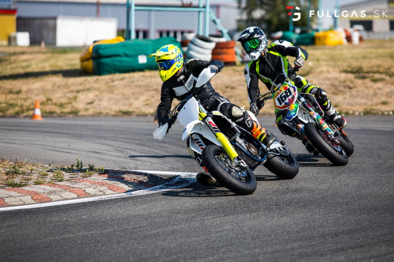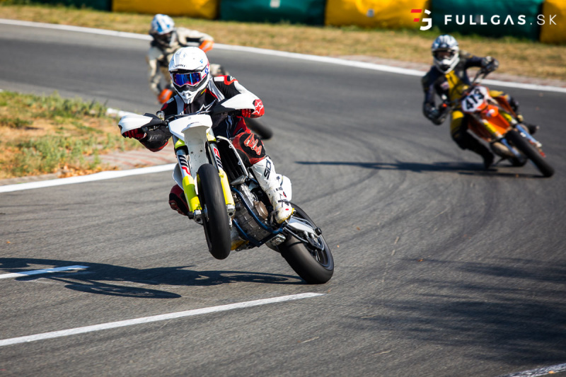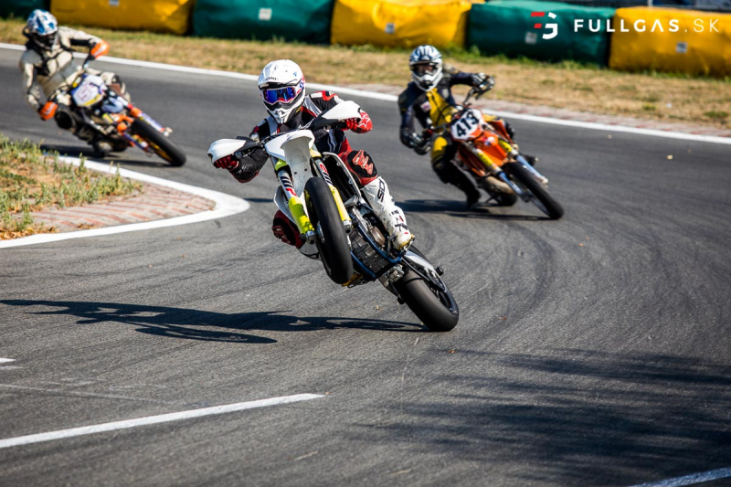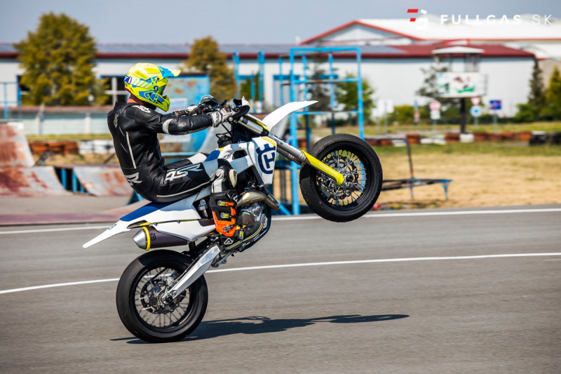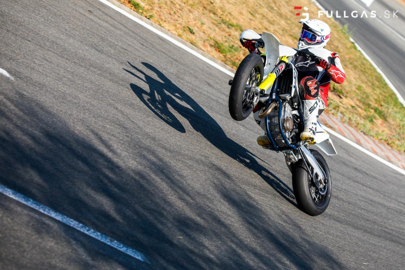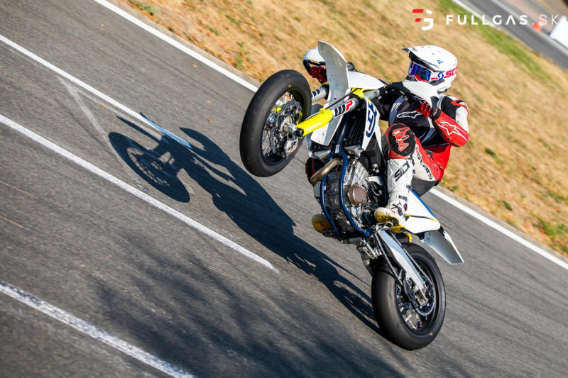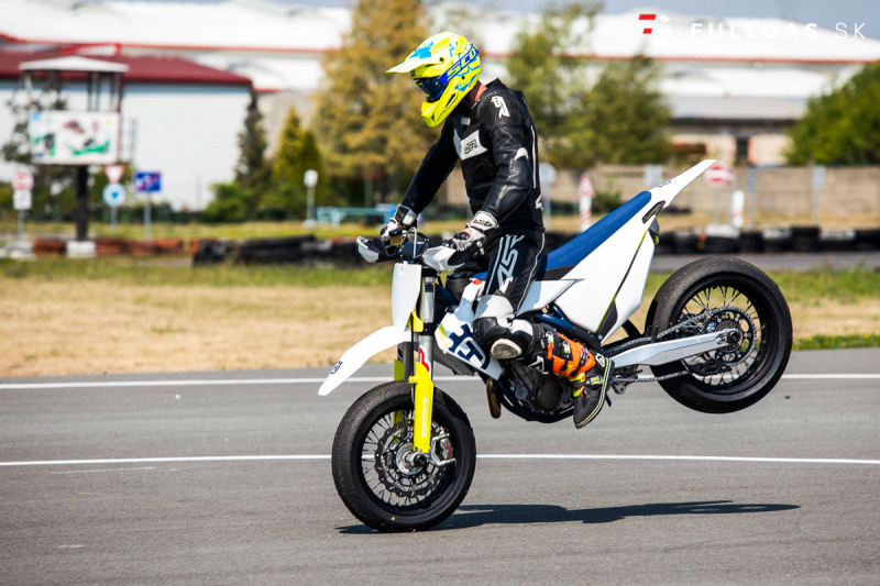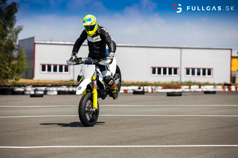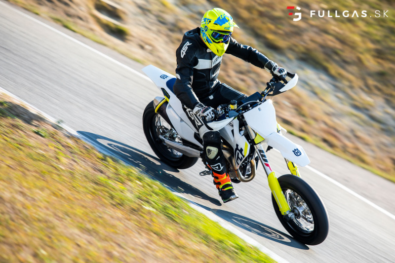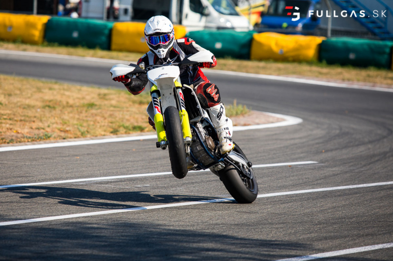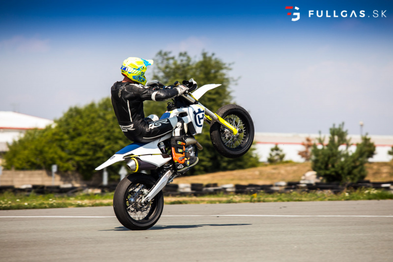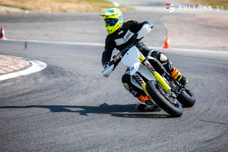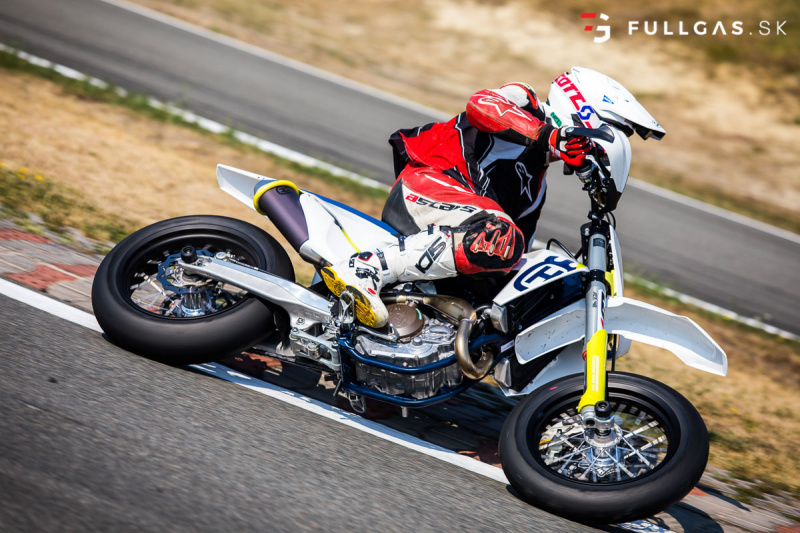Husku som mal možnosť pojazdiť aj vďaka silnicnimotoskola.cz v rámci ich motoškoly a voľného jazdenia na Autodrome vo Vysokom Mýte. Organizácia, jedlo, pitie, sociálky a hlavne trať s perfektným asfaltom. K tomu, samozrejme, skúsení jazdci a inštruktori, ktorí boli ochotní vždy pomôcť a poradiť aj s technikou jazdy. Ich rady a tipy mi dosť pomohli zmeniť štýl a vtedy som dokázal FSku ešte lepšie odskúšať. Na prvé ranné kolá sadám na motorku s 0,3 motohodinami, bez nahriatia pneu a s nenaučenou traťou. Od úplného začiatku som milo prekvapený veľkosťou, vlastne skôr minimálnosťou a tým, ako mi sadla hneď do ruky. Pri príjazde na trať ešte doladiť za jazdy spoječku a šup ho učiť sa trať. Na motorku si zvykať fakt netreba. Pár kôl decentne, sem tam mi ešte zadné trochu odskakuje na brzde, ale nič nepredvídané. Po viac ako pol hodine idem z toho dolu, aj keď sa mi vôbec nechce. Je to paráda, a to som ešte ani nezačal tlačiť na moje limity. Neskôr výmena oleja a filtra, podfúkli sme pneu na 1,8 za tepla, trochu ešte pridvihli páčky, doplnili benzín a šup ho znova na trať, ale teraz už za doprovodu Milana, inštruktora z motoškoly a môjho známeho, ktorý má FSko model 2018.