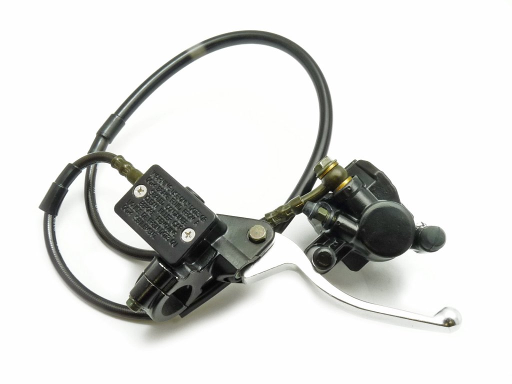 Originálna pitbike Stomp, Tomanon; predná brzda komplet obsahuje jednopiestkový brzdič s brzdovými doštičkami typ02, hadicu a brzdovú pumpu so sklopnou páčkou Stomp Juicebox, dĺžka hadice 78cm, rozteč dier na pripevnenie k vidlici 44mm použité na modeloch:- Stomp Jucebox110