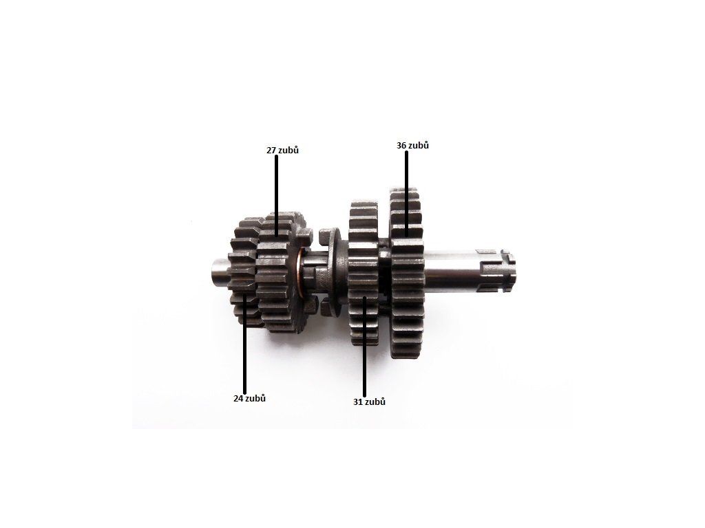 originálne pitbike GN, Tomanon; prevodovka proti hriadeľ pre motor GN120; hriadeľ primárne koliesko 17mm, hriadeľ karter pravá strana 12mm, celková dĺžka 116,6mm, počet zubov jednotlivých ozubených koliesok viď. obrázok. V kombinácii s hlavným hriadeľom (katalógové číslo: 000656) je prevodový pomer 1. stupňa – 11/36(3,272), 2. stupňa – 16/31(1,937), 3. stupňa –20/27(1,350), 4. stupňa Iba v kombinácii s hlavným hriadeľom katalógové číslo: 000656 náhradný diel pre motor: GN120Dodatočné parametre