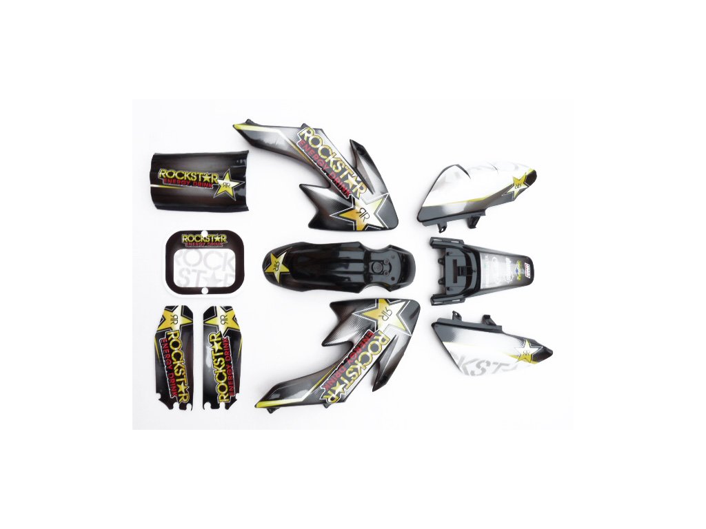 originálne pitbike Stomp, Tomanon; sada plastov CRF 50 s polepmi Rockstar, farba plastov čierna; plasty sú vyrobené z polypropylénu, ktorý zaručuje vysokú odolnosť proti poškodeniu/ zlomeniu (vysoká ohybnosť), polepy sú kvalitné (hrúbka 1mm) – odolné proti poškodeniu, použité 3M lepidlo; sada obsahuje: predný blatník, zadný blatník, pravý – ľavý zadný bok, pravý – ľavý predný bok, predná tabuľka, polepy chráničov vidlíc (iba len polepy), prebal riadidiel; náhradný diel pre modely: Stomp Juicebox( starší model s CRF50 plastmi) Stomp Superstomp( starší model s CRF50 plastmi) DemonX DXR( starší model s CRF50 plastmi)Dodatočné parametre