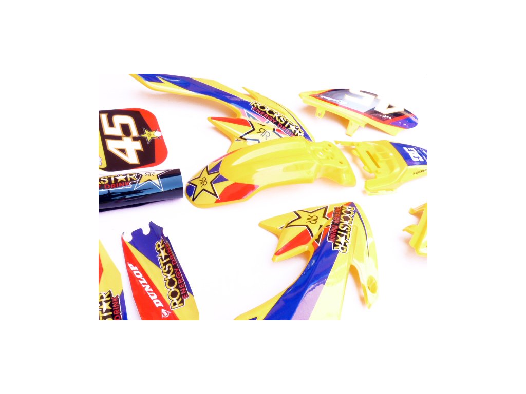 originálne pitbike Stomp, Tomanon; sada plastov CRF 50 s polepmi Rockstar/ žltá, farba plastov žltá; plasty sú vyrobené z polypropylénu, ktorý zaručuje vysokú odolnosť proti poškodeniu/ zlomeniu (vysoká ohybnosť), polepy sú kvalitné (hrúbka 1mm) – odolné proti poškodeniu, použité 3M lepidlo; sada obsahuje: predný blatník, zadný blatník, pravý - ľavý zadný bok, pravý - ľavý predný bok, predná tabuľka, polepy chráničov vidlíc (iba len polepy), prebal riadidiel náhradný diel pre modely: Stomp Juicebox( starší model s CRF50 plastmi) Stomp Superstomp( starší model s CRF50 plastmi) DemonX DXR( starší model s CRF50 plastmi)Dodatočné parametre